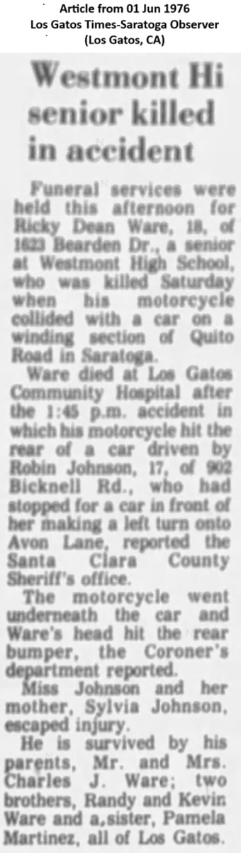 Ricky Dean "Rick" Ware 1/9/1958 - 5/29/1976 Age 18